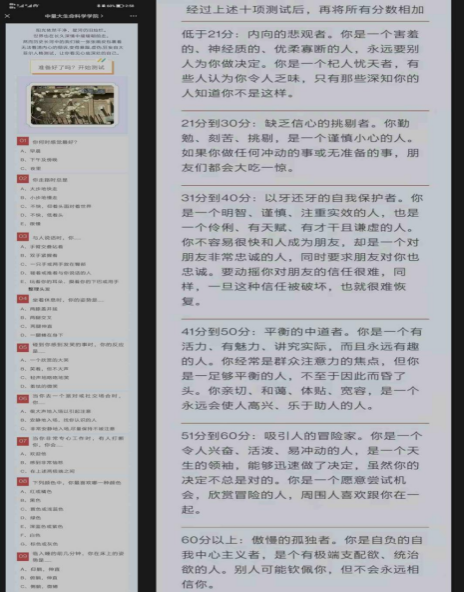 测试通过十个选择题,不同选项分数相加,最后的分数阶段对应了不同的人格:悲观者、挑剔者、自我保护者、中道者、冒险家、孤独者。推文还对每个人格进行了讲解,让同学更清楚了解自己的性格。
