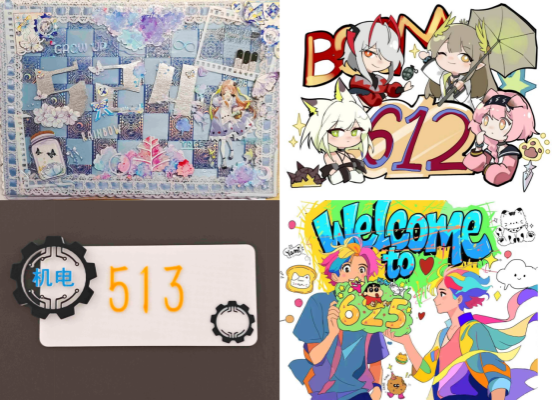“寝室门牌创意挑战赛” 鼓励学生用创意赋予门牌情感温度,各寝室将个性融入方寸之间:22 级 9 北 513 寝室用 3D 打印技术制作立体装饰,让专业特色成为门牌符号;24 级 5 南 612 寝室手绘四人卡通形象,勾勒室友间的温暖羁绊;更有寝室设计可翻转 “心情晴雨表”,通过颜色传递当日情绪,让门牌成为无声的情感纽带。这些作品超越编号功能,让寝室从冰冷房号蜕变为承载记忆的 “精神坐标”。当创意与情感在门牌上交织,每个设计都成为寝室文化的外显符号,默默凝聚着成员对 “我们的小窝” 的认同与归属。