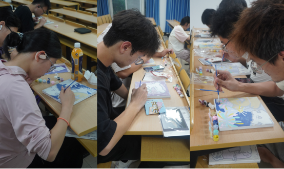 活动现场,温馨且静谧。同学们围坐,面前摆放着风格各异的数字油画,从烂漫花海到宁静山水,再到温暖的家庭场景,题材丰富多样。大家手持画笔,依照数字标识认真填色。在色彩交织间,同学们沉浸其中,内心的压力渐渐消散。“平时总是很浮躁,在填色时,我难得地平静下来,专注于当下,感觉特别放松。” 一位同学分享道。