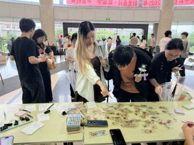 活动伊始,同学们重温了端午文化视频。随后,同学们开始香囊制作和漆扇创作。毕业生们将手中的布料、丝线、艾草、薰衣草等香料参照教学视频,从裁剪布料、填充香料,到穿针引线、装饰点缀。指尖穿梭间,原本零散的材料渐渐变成一个个精美别致的香囊。淡雅的药香萦绕四周,毕业生们在一针一线的专注中,焦虑与压力得到舒缓,收获了满满的成就感。漆扇环节,水桶中盛放着色彩斑斓的漆料,大家小心翼翼地将喜欢的漆加入水中,看着颜料在水面晕染化开,形成独特的图案。随后,将空白扇子缓缓放入水中转动,待扇面完全浸入后轻轻取出,一幅独一无二的漆扇作品便诞生了。整个过程充满惊喜与创意,同学们纷纷发挥奇思妙想,创作出各具特色的作品,仿佛寄语毕业生们在新的人生征途中开启新的五彩生活。