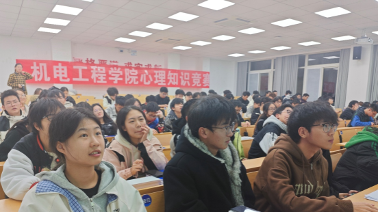 为普及心理健康知识,提升学子心理调适能力,营造积极健康的校园氛围,近日,机电工程学院心理权益部在翔宇106举办心理知识竞赛。来自25级的 8 支团队参赛,80 余名学生现场观赛。